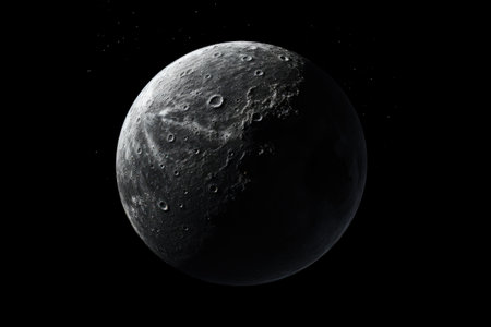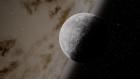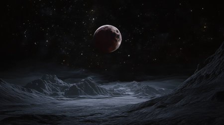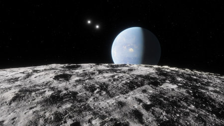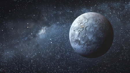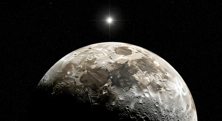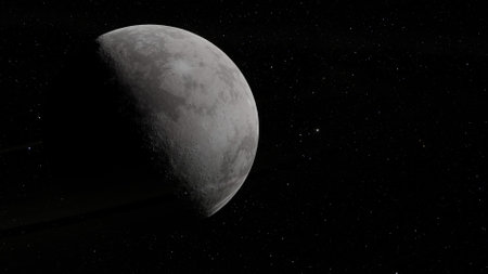 The surface of the moon with craters in outer space. Moon with stars. High-resolution image capturing the lunar surface at the edge of dawn