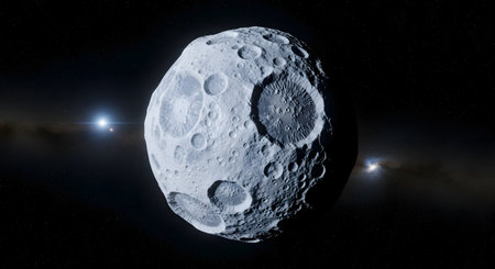 A detailed 3D rendering of a large, heavily cratered asteroid or dwarf planet, like Vesta or Ceres, floating in the vastness of deep space. Distant stars and galaxies are visible in the background, creating a scientifically accurate and awe-inspiring celestial scene.