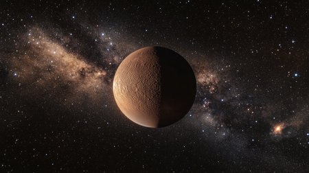 This breathtaking image depicts a brown planet set against a backdrop of bright stars and cosmic dust, showcasing the beauty of outer space.