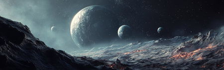 science fiction wallpaper, cosmic landscape, realistic exoplanet, beautiful alien planet in far space, detailed planet surface 3d render