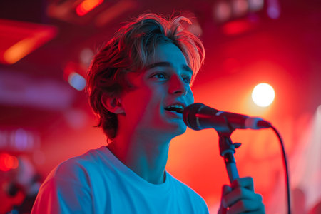 A passionate singer captivates the audience on stage, holding a microphone. The dramatic lighting sets a vibrant atmosphere, enhancing the emotional performance.