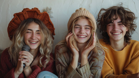 Group of friends in warm sweaters and hats singing into microphone.