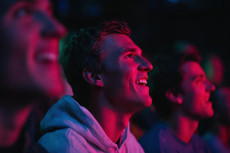 Senior men are captured enjoying a sports night, with neon lights reflecting on their faces. The image features a joyful energy and cinematic color tone, using shallow depth-of-field.