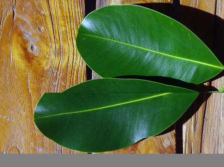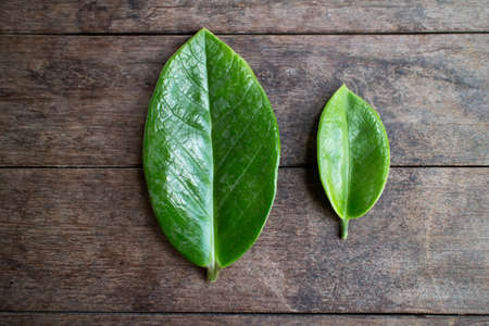 Calophyllum inophyllum leaves, are a large evergreen plant, commonly called mastwood, beach calophyllum, on wood table.
