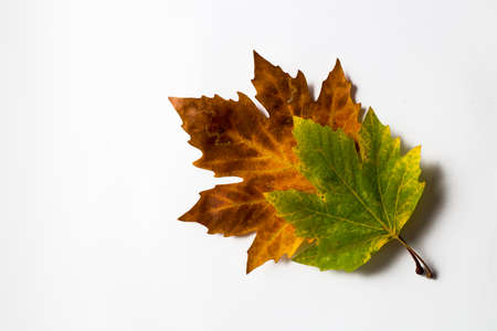 Autumn and spring. Green and fallen autumn leaf on green yellow background