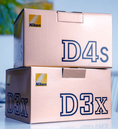 Paris, France - Feb 28, 2017: Cardboard boxes packs with new professional Nikon D3X DSLR and D4s cameras new professional equipment for photo studio