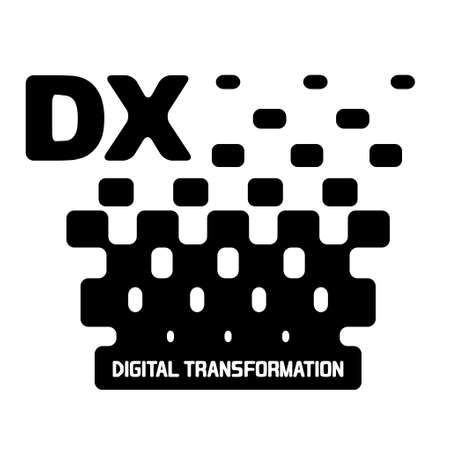 As the black block shape goes up, it changes to a dot shape. Notation of DX in black letters. Notation of DIGITAL TRANSFORMATION in white letters. An illustration that imagines DIGITAL TRANSFORMA