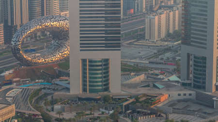 Dubai museum of future exterior design aerial timelapse.
