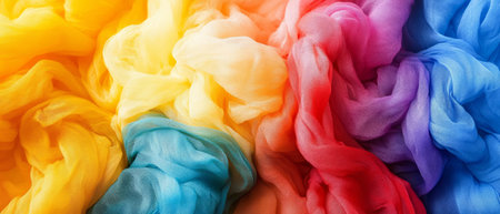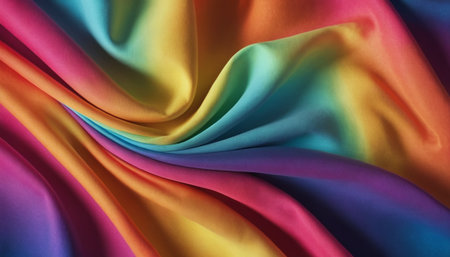 A visually stunning display of flowing colorful silk and burlap fabric arranged in a vibrant rainbow pattern. This captivating image showcases the interplay of textures, with the flowing, smooth silk contrasting against the natural burlap. The colorful textile arrangement creates a captivating background, ideal for art, design, and fashion projects. The vibrant color palette and artistic composition highlight elegance and style, perfect for adding a creative touch to any project. The draped cloth evokes a sense of movement and sophistication.