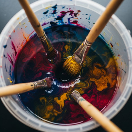 Vibrant image of colorful paint jars with splashes of paint around them, showcasing a playful and creative art scene filled with bright hues.