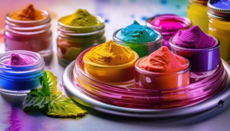 Colorful powder pigments fill containers, creating a captivating display of vibrant hues