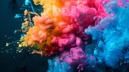 A dynamic visual of vibrant, colorful clouds of powder in motion against a dark background, creating a dramatic effect.