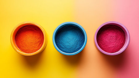 Three colorful bowls of powder arranged on a vibrant gradient background, creating a bold and dynamic composition.
