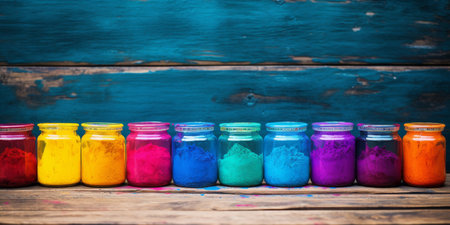Happy Holi the Hindu Festival. Open paint cans with bright, colorful pigments on blue rustic wood. Concept Indian color festival. Vibrant Powder Colors in Glass Jars on Wooden Surface. Generative ai.