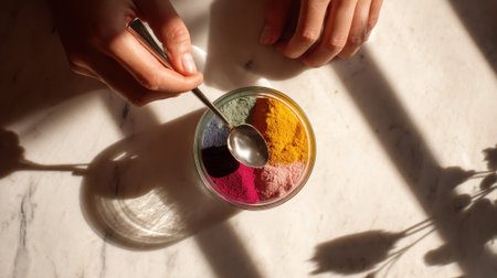 Bright colorful powders in a glass bowl with natural sunlight and shadows on marble, creative food ingredients concept with vibrant artistic presentation.