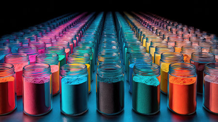A striking display of vibrant jars filled with colorful powders, showcasing a creative gradient backdrop. Perfect for artistic projects and craft inspirations.