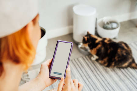 Female hands holding smartphone and using application to control cat food dispenser. Cat eating from smart feeder in cozy home interior on background. Home life with a pet. Healthy pet food diet.