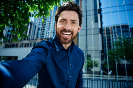 Young confident businessman taking a selfie outdoors with urban background, showcasing a positive and professional demeanor
