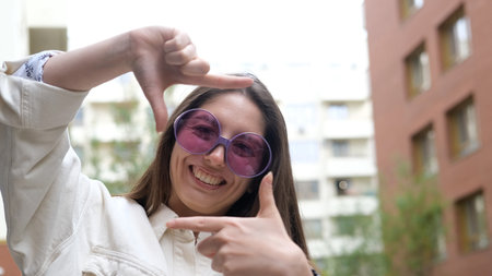 A sweet, cheerful, and charming girl poses for the camera on a city street in the summer. The woman holds up a hand-made frame, like a photograph.