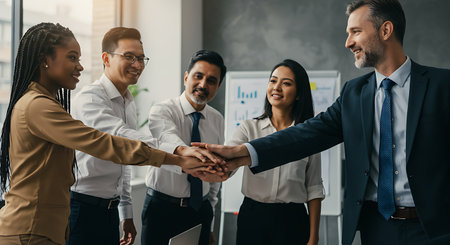 Team of diverse professionals in a modern office joins hands for a collaborative meeting