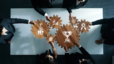 A top-down view of professionals collaborating around gear-shaped symbols representing growth and success, emphasizing teamwork and strategic planning in a corporate environment.
