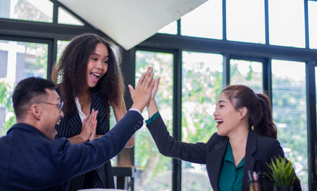 Diverse asian business team celebrating and giving high fives during boardroom meeting. business financial concept