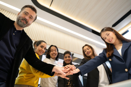 Group of diverse office worker join hand together in ornamented office room symbolize business synergy and strong productive teamwork in workplace. Cooperation and unity between business employee.