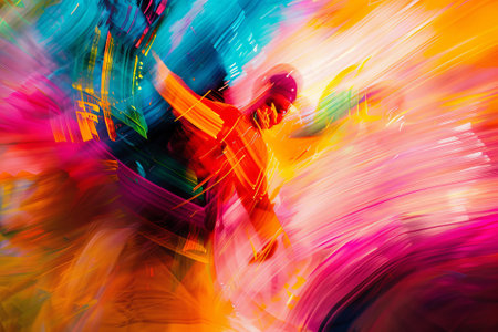 A Swirling colors create energetic atmosphere, capturing essence of movement and excitement