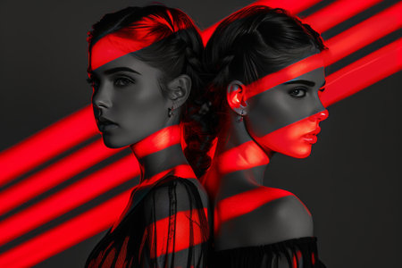 Exploring contrast and harmony in dual profile portraits highlighted with red accents