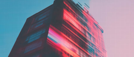 Distorted cityscape with vibrant glitch colors and motion blur effects