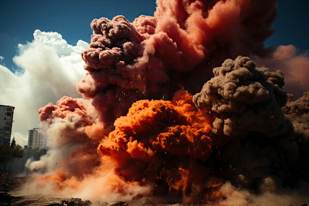 A massive explosion creating a voluminous cloud against a stark black background, capturing the chaotic and intense essence of the moment.