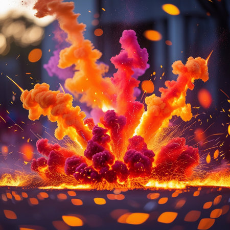 Intense night explosion with fiery blasts and billowing smoke, surrounded by flying sparks and debris, creating a dramatic and chaotic scene.