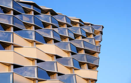 Architecture exterior facade view of modern building wall with lights and shadows. Modern urban architecture is a waves shaped building abstract background. Street photo, nobody, selective focus