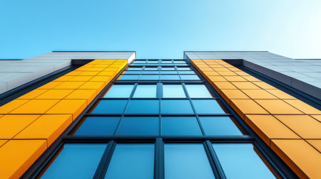 A modern office building exterior with blue glass windows and yellow panels under clear sky, showing upward perspective and growth
