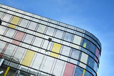 Close-up view of a modern glass building showcasing a unique facade with reflections of light and color. This image captures the essence of contemporary urban architecture.