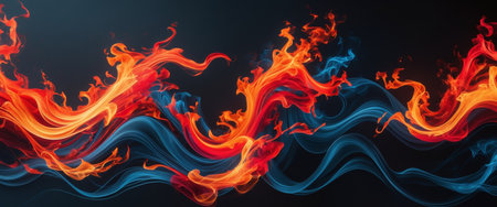 AI Generated. Abstract fiery red and cool blue swirling flames on a dark background