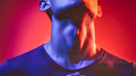 A man grapples with intense chest pain, his expression conveying distress while illuminated by a striking red and blue backdrop that enhances the turmoil.