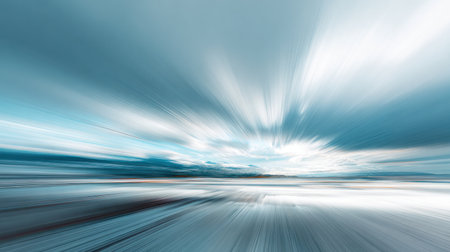An abstract image showcases a blurred landscape with a focus on speed and movement. Soft blue and white hues create a dreamlike atmosphere. The composition emphasizes lines and light, suggesting a vast, open environment. This imagery could be utilized for various commercial and artistic purposes.