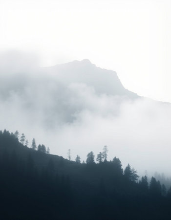 A mesmerizing view of misty mountains with soft light filtering through the fog. This tranquil landscape evokes a sense of peace and harmony in nature.