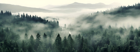 Mist-covered forest photo realistic illustration - Generative AI.