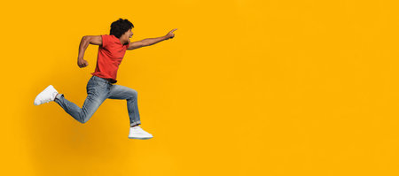 Young Man Running Energetically Against a Vibrant Yellow Background in a Casual Outfit