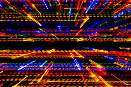 Colorful city lights create streaks and abstract patterns across the night sky with motion blur effect
