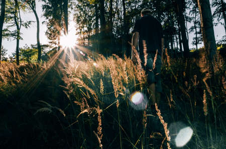 Golden sunlight filtering through lush green foliage, creating a peaceful and serene natural environment, perfect for outdoor and nature themes.