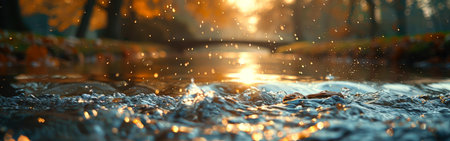 A dynamic water splash in a sunlit forest stream with vibrant green reflections. Clear details and vibrant col...