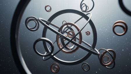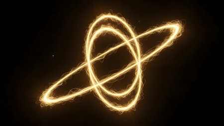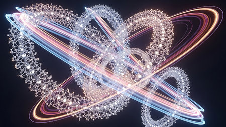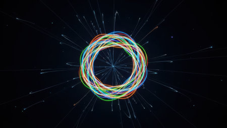 Glowing, interwoven rings of light in various colors, against a stark black background