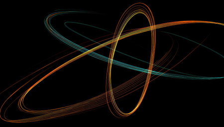 This abstract composition features looping lines in shades of orange, yellow, and teal against a dark backdrop. The image utilizes a digital art style, suggesting motion and energy. Suitable for a variety of uses, this graphic can be incorporated into design projects and promotional materials.