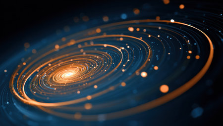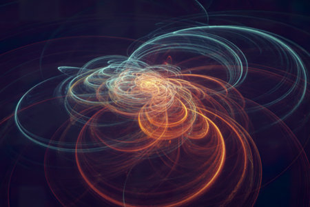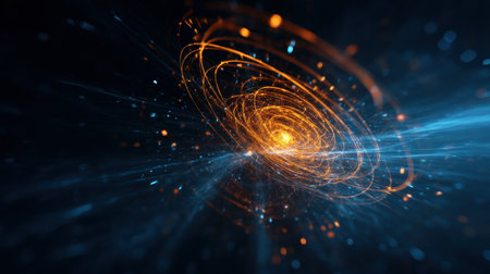 Swirling orange and blue spiral resembling a galaxy or energy flow. Bokeh dots scattered