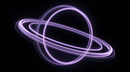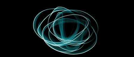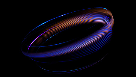 Abstract glowing neon light trails forming circular artistic shape on dark background.