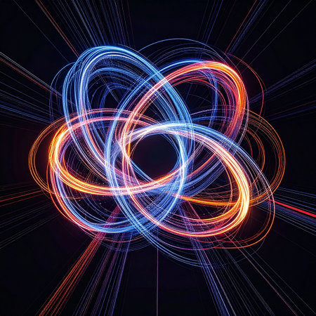 Streams of blue and orange light intertwine in a complex dance, visualizing the chaotic yet harmonious flow of quantum particles or high-speed data.