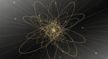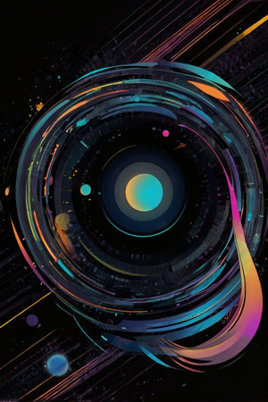 Vibrant orbs and swirling lines create a dynamic cosmic pattern, showcasing energy and movement in a dark, captivating background.
